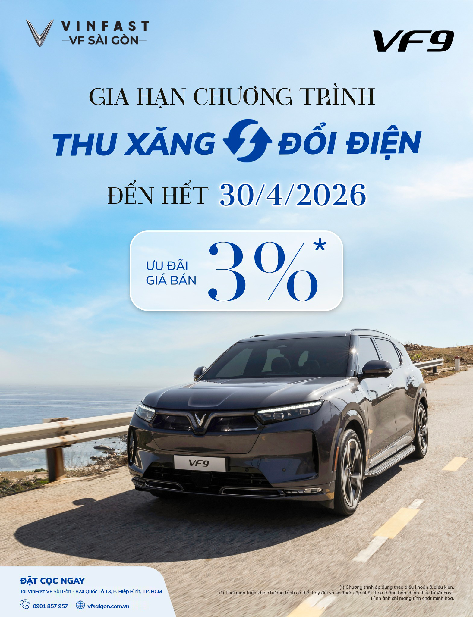 Trước những biến động liên tục của chi phí nhiên liệu toàn cầu và xu hướng chuyển đổi sang phương tiện thân thiện môi trường, VinFast VF Sài Gòn chính thức gia hạn chương trình “Thu Xăng - Đổi Điện” đến hết ngày 30/04/2026.