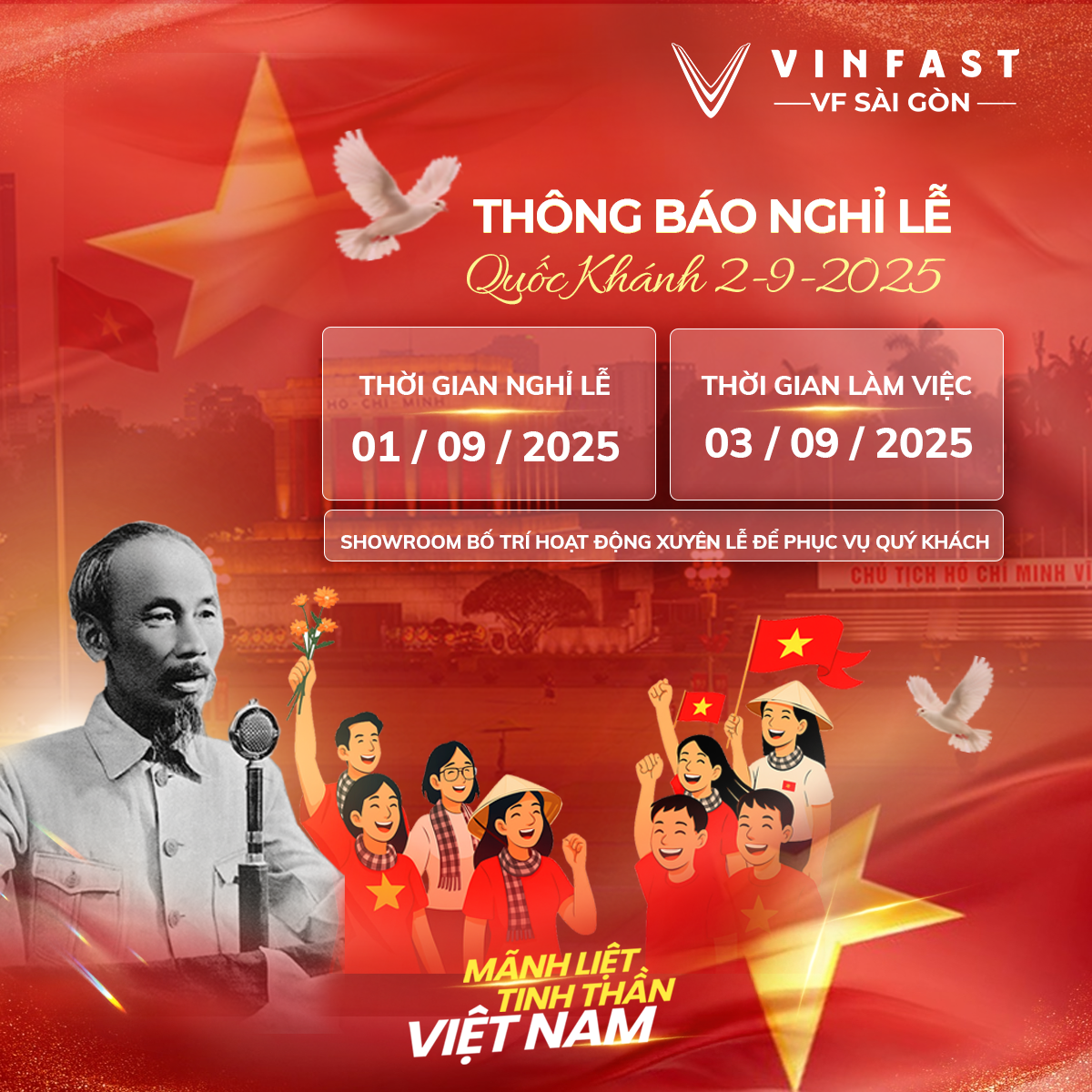 ❤️🔥 Nhân dịp kỷ niệm 80 năm ngày Quốc Khánh Việt Nam – dấu son lịch sử của dân tộc, VinFast VF Sài Gòn hân hoan thông báo đến Quý Khách hàng, Quý Đối tác lịch nghỉ lễ như sau:▸ Thời gian nghỉ lễ: Thứ Hai (01/09/2025) đến Thứ Ba (02/09/2025)