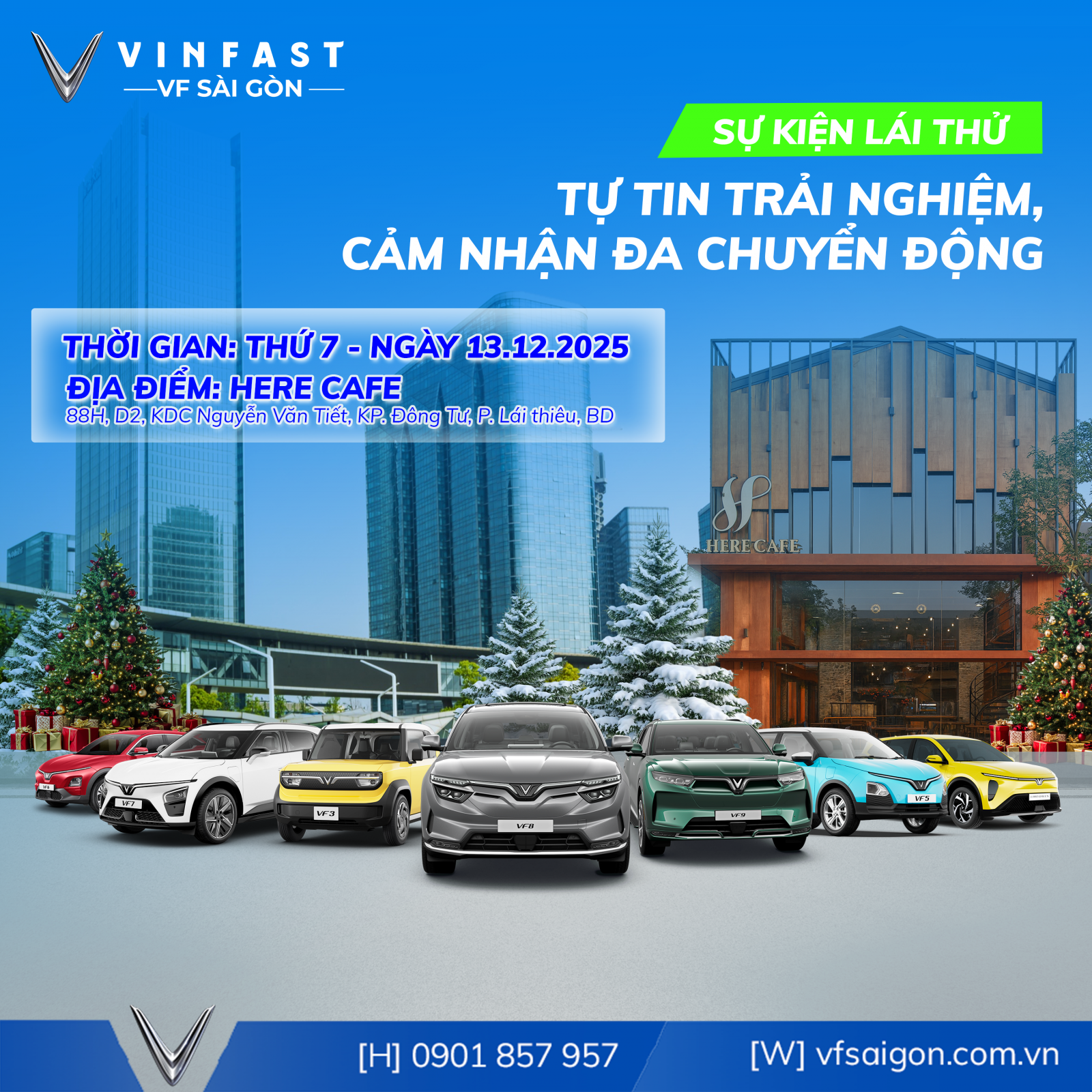 Cuối năm luôn là thời điểm lý tưởng để khách hàng trực tiếp cảm nhận công nghệ, hiệu suất và loạt tiện ích thông minh trên các dòng xe điện VinFast. Nhằm mang đến cơ hội trải nghiệm chân thực nhất, VinFast VF Sài Gòn trân trọng giới thiệu sự kiện lái thử đặc biệt – nơi bạn có thể tự tay cầm lái những mẫu xe điện đang “làm mưa làm gió” trên thị trường.