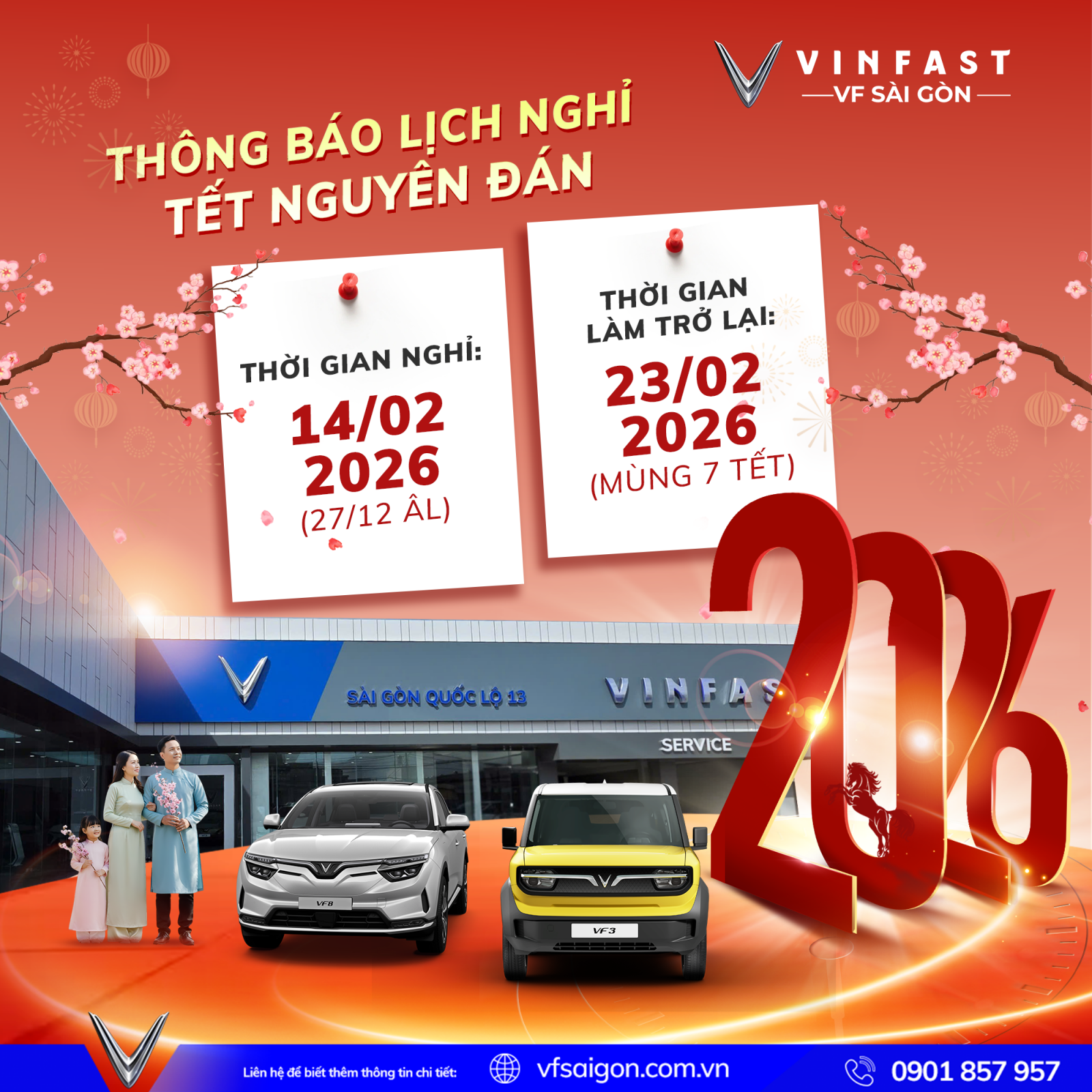 • Trong không khí rộn ràng chào đón Xuân Bính Ngọ 2026, VinFast VF Sài Gòn xin trân trọng thông báo đến Quý Khách hàng và Quý Đối tác lịch nghỉ Tết Nguyên Đán năm 2026 nhằm giúp Quý khách thuận tiện trong việc sắp xếp thời gian mua xe, bảo dưỡng và sử dụng dịch vụ.